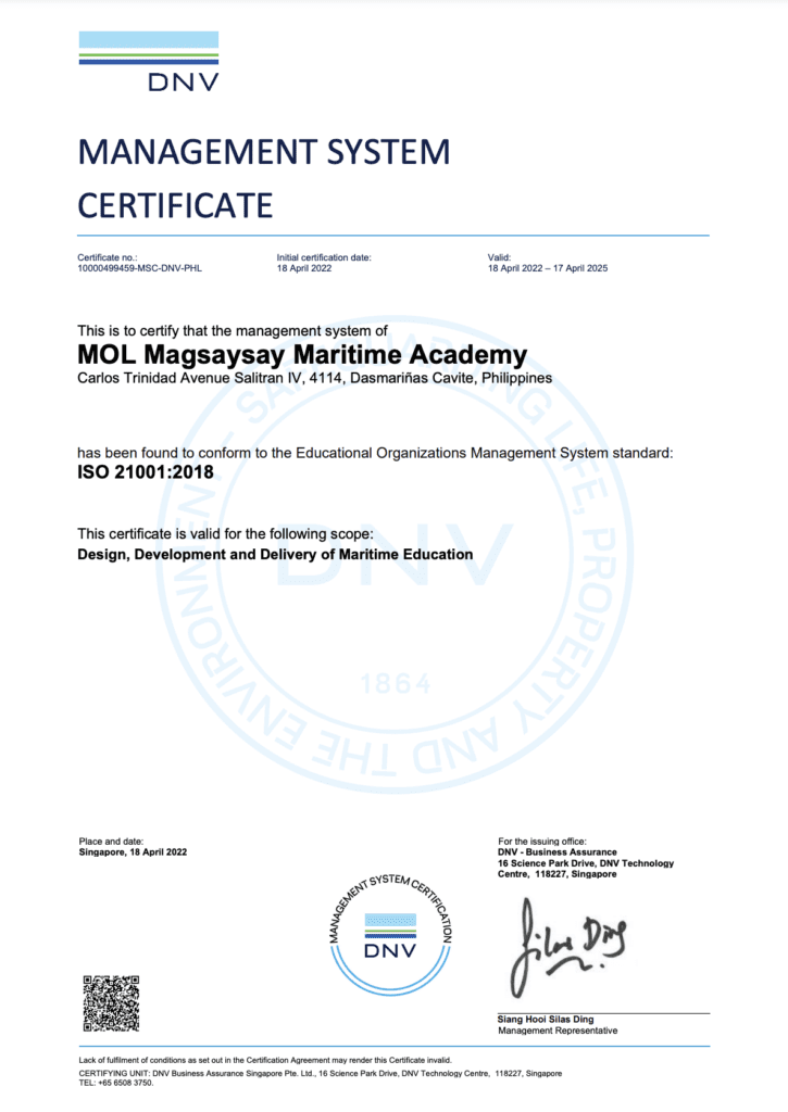 MOL Magsaysay Maritime Academy is certified by DNV to international standards such as ISO 9001:2015. This certification ensures that the academy meets high-quality management standards in providing maritime education and training. It covers various aspects of the institution’s operations, including safety, security, and working conditions, which are crucial for producing globally competitive seafarers and marine officers.